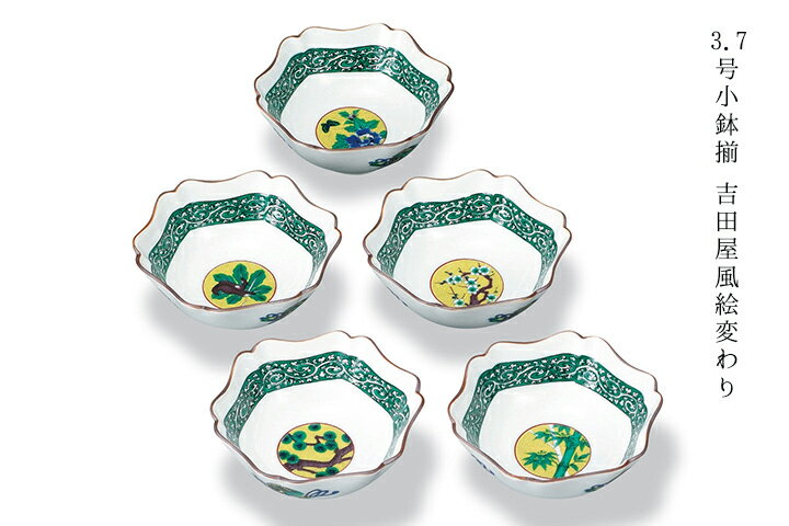 【九谷焼】3.7号小鉢揃 吉田屋風絵変わり【九谷焼】3.7号小鉢揃 吉田屋風絵変わり 商品説明 <約360年続く歴史ある、九谷焼の世界> 九谷焼の特徴は、「呉須(ごす)」とよばれる藍青色で線描きし、「五彩」とよばれる、赤・黄・緑・紫・紺青の5色での絵の具を厚く盛り上げて塗る彩法です。